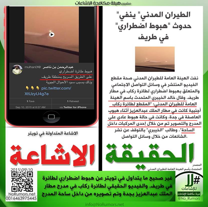 Sebaliknya, sebuah twitter popular Arab Saudi, No_Rumors menjelaskan kejadian itu sebetulnya berlaku di Lapangan Terbang Raja Abdulaziz di Jeddah dan pesawat tidak mendarat di atas jalan raya tetapi landasan.